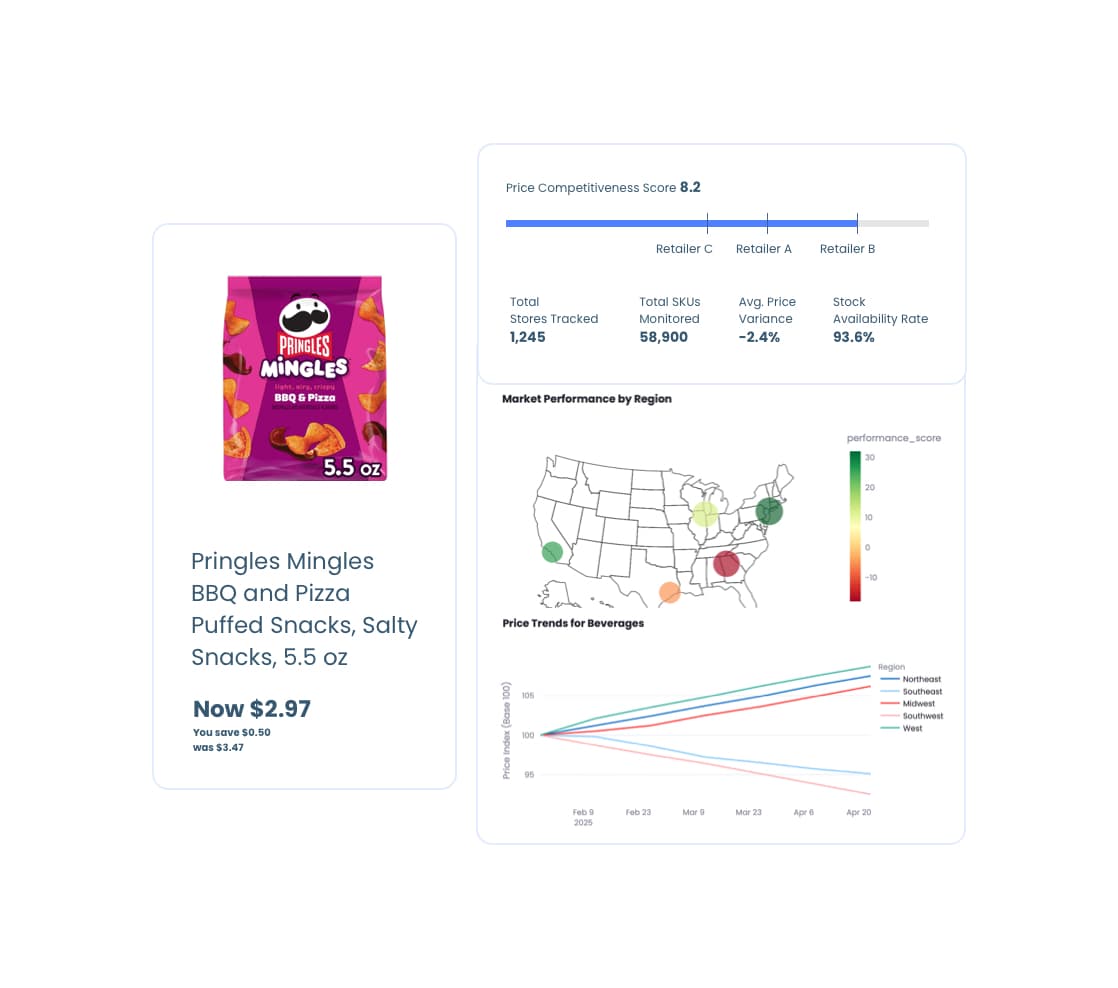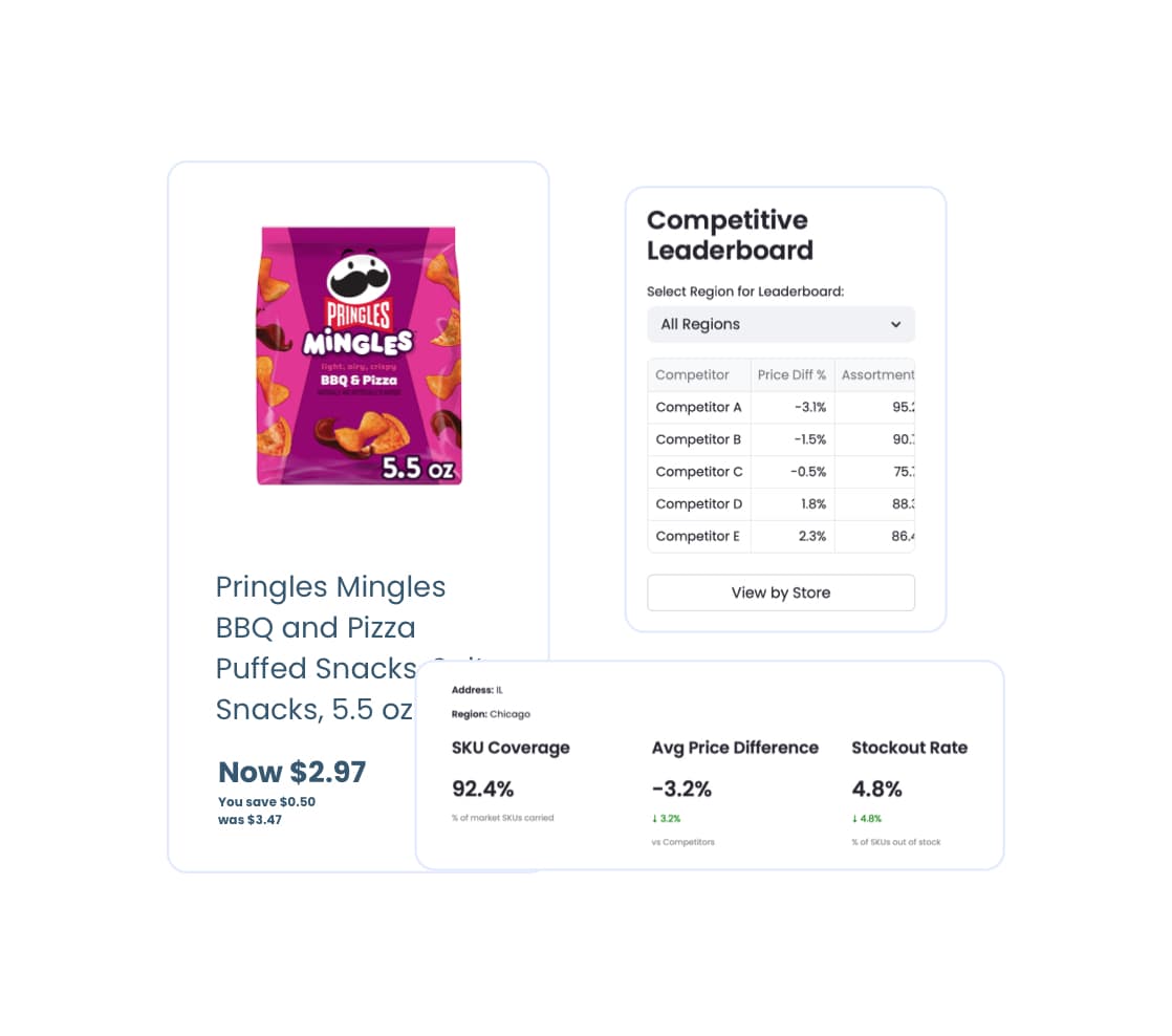 Gain visibility into pricing, assortment, and availability across every store and SKU - so you can respond faster, optimize smarter, and stay ahead of the competition